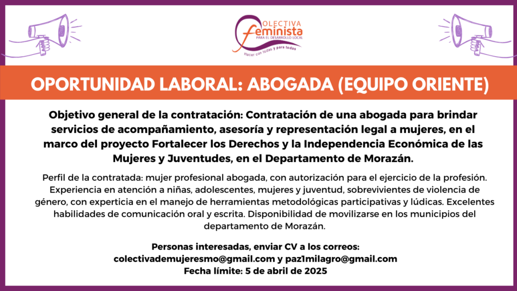 Contratar de una Abogada para brindar servicios de acompañamiento, asesoría y representación legal a mujeres, en el marco del proyecto Fortalecer Los Derechos Y La Independencia Económica de Las Mujeres Y Juventudes, en el Departamento de Morazán.